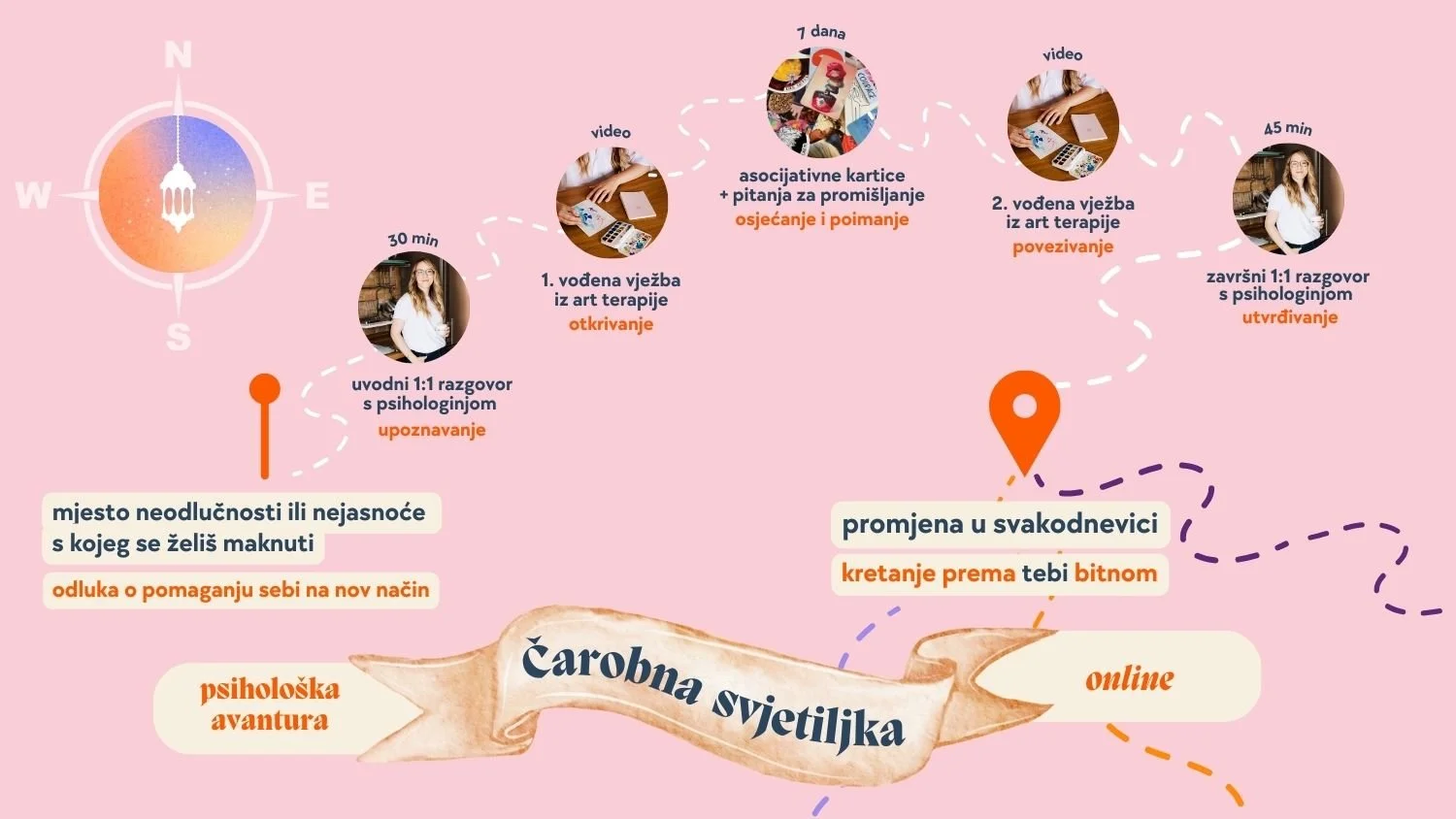 Čarobna svjetiljka dostupna ti je u bilo kojem trenutku, kao online program kroz koji prolaziš samostalno u vrijeme koje tebi najbolje dogovara, uz 1:1 razgovore sa mnom koje dogovaramo na početku i kraju avanture.